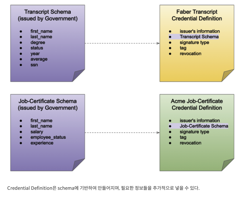 goverment 는 기본 스키마를 ledger에 저장해두며 Faver college 는 alice 에게 성적표 발급에 필요한 Transcript Credetial Definition(성적 증명서 자격 정의) 을 만들어서 ledger 에 저장하고, Scme Corp 은 재직증명서를 발급하는데 필요한 job-