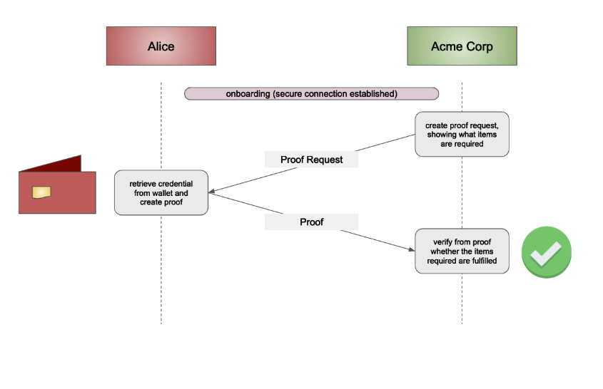 acme corp 은 alice 가 전송해준 증명을 통해 전송 받은 정보가 faber college 로부터 발급된 정보라는 것을 확인.