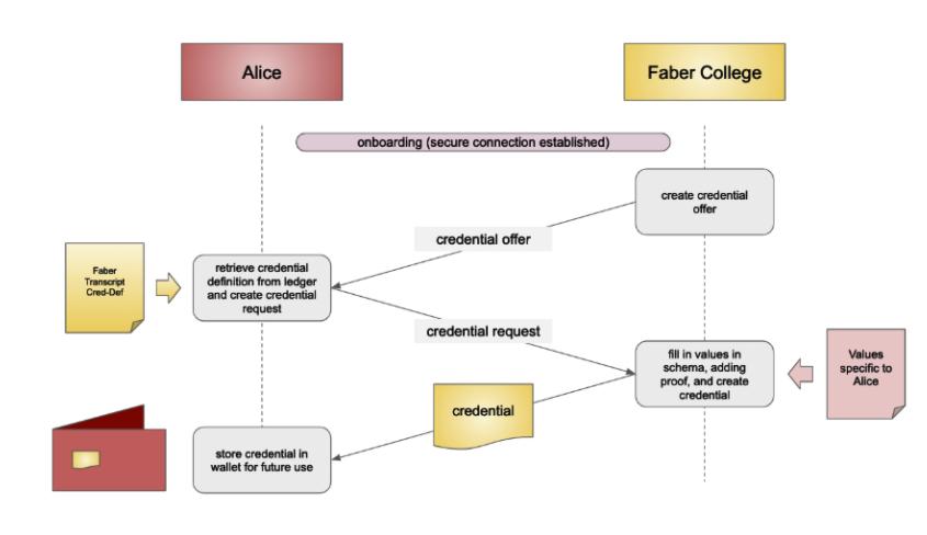 alice 는 credential 을 faber college로 부터 발급받기 위하여 faber college 와 secure channel 을 생성한다.