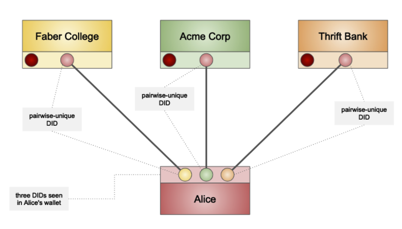 이 네트워크에서 alice 는 어떻게 식별될까? alice 는 가각의 조직과 의사소통을 할때마다 다르 did를 이용한다.