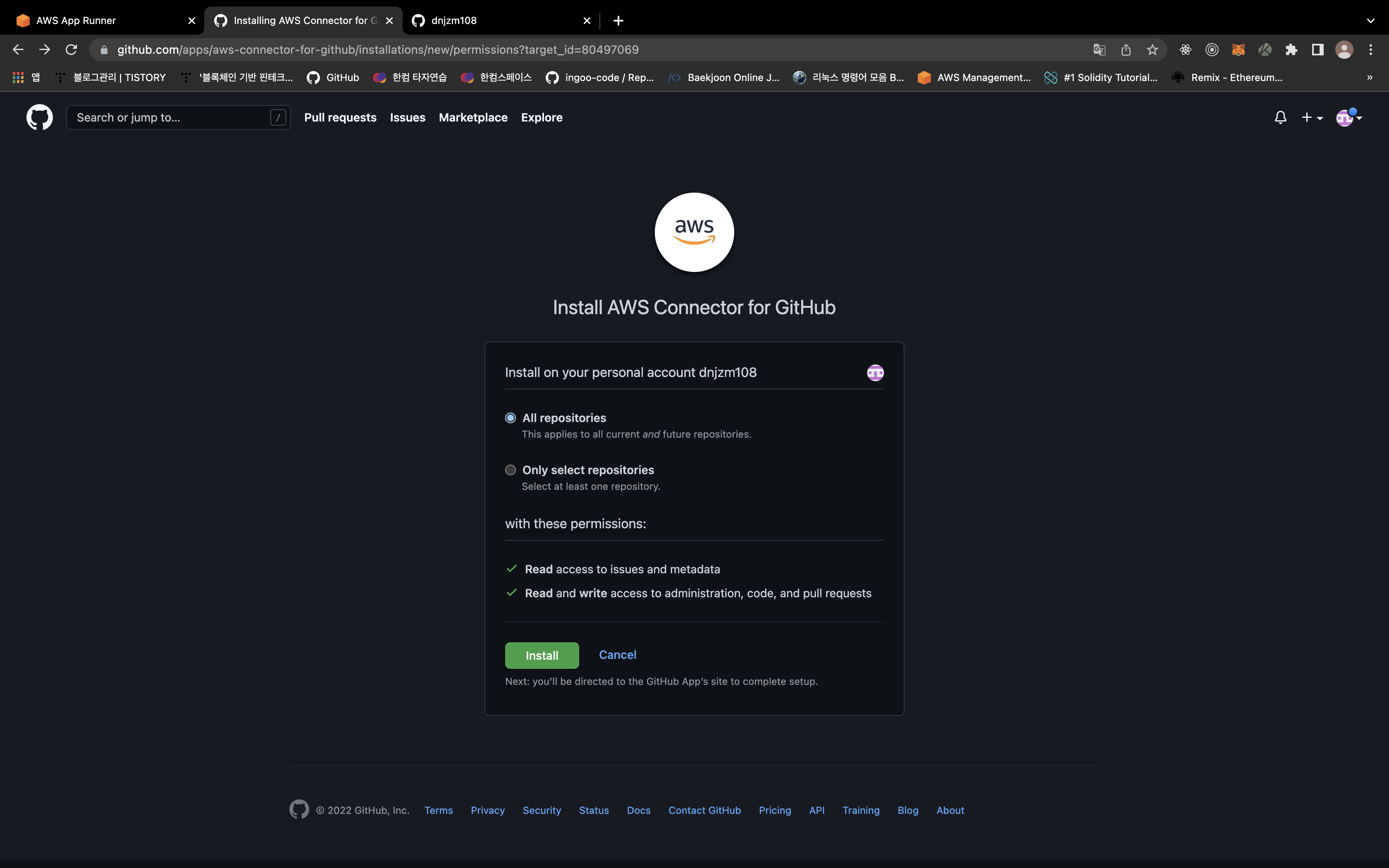 aws 에 로그인 후 검색창에 app runner 에 검색 후 들어간다.