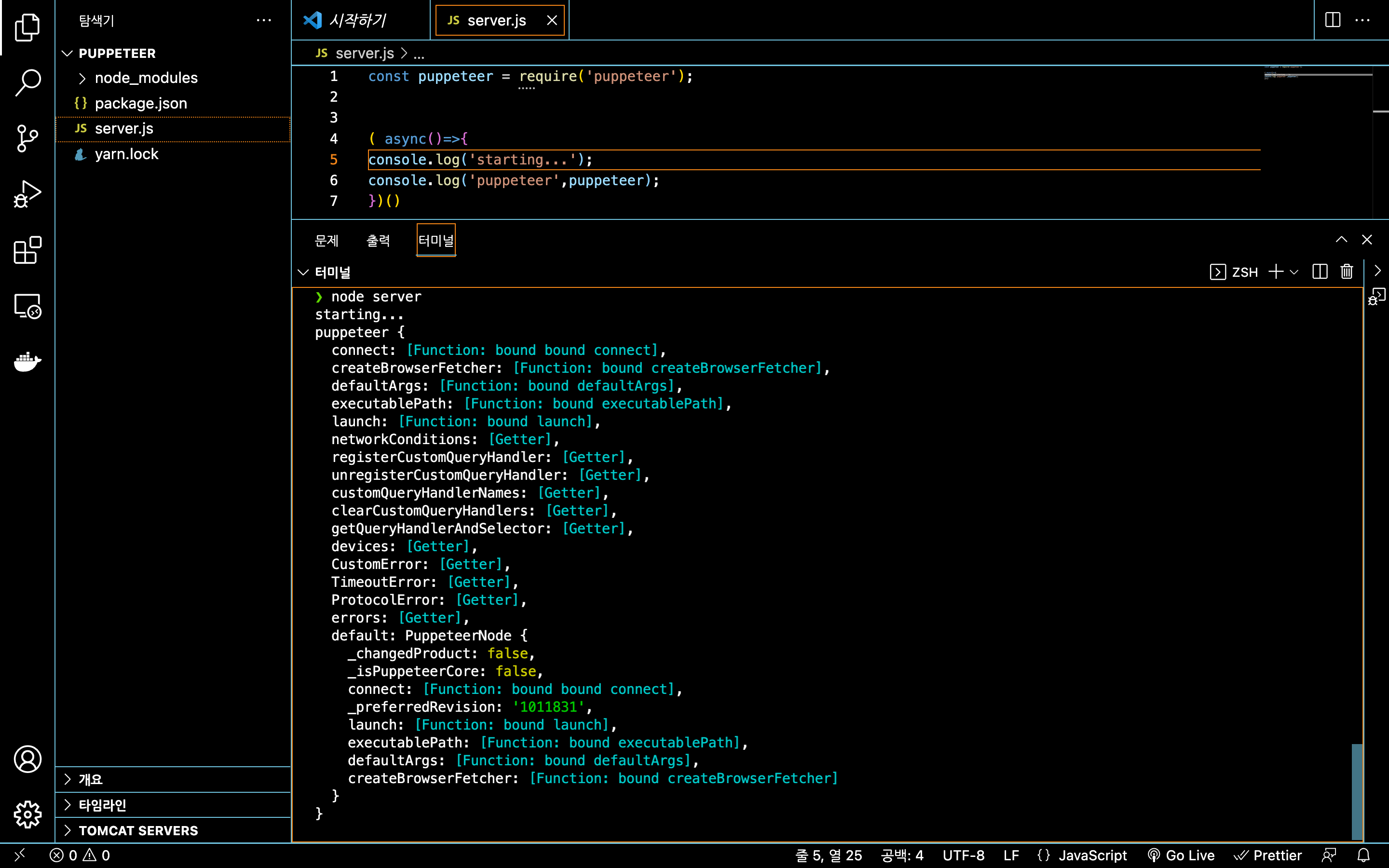 puppeteer 란? 구글에서 만든 웹브라우져 자동화 라이브러리 구글에서 만들었기 때문에 크롬 혹은 크로미엄 에서만 작동 하다. nodejs 가 깔린 상태에서 먼저 빈폴더를 생성 후 npm init of yarn init npm install puppeteer or yarn add puppeteer 파일을 하나 생성하자 나는 server.js 로 만들겠다 잘 불러왔는지 확인하기 위해 함수를 만들고 실행 시켜보자 const puppeteer = require('puppeteer'); ( async()=>{ console.log('starting...'); console.log('puppeteer',puppeteer); })() $ node server.js 하면 잘 실행 된걸 알 수있다. 여기서 .js ..